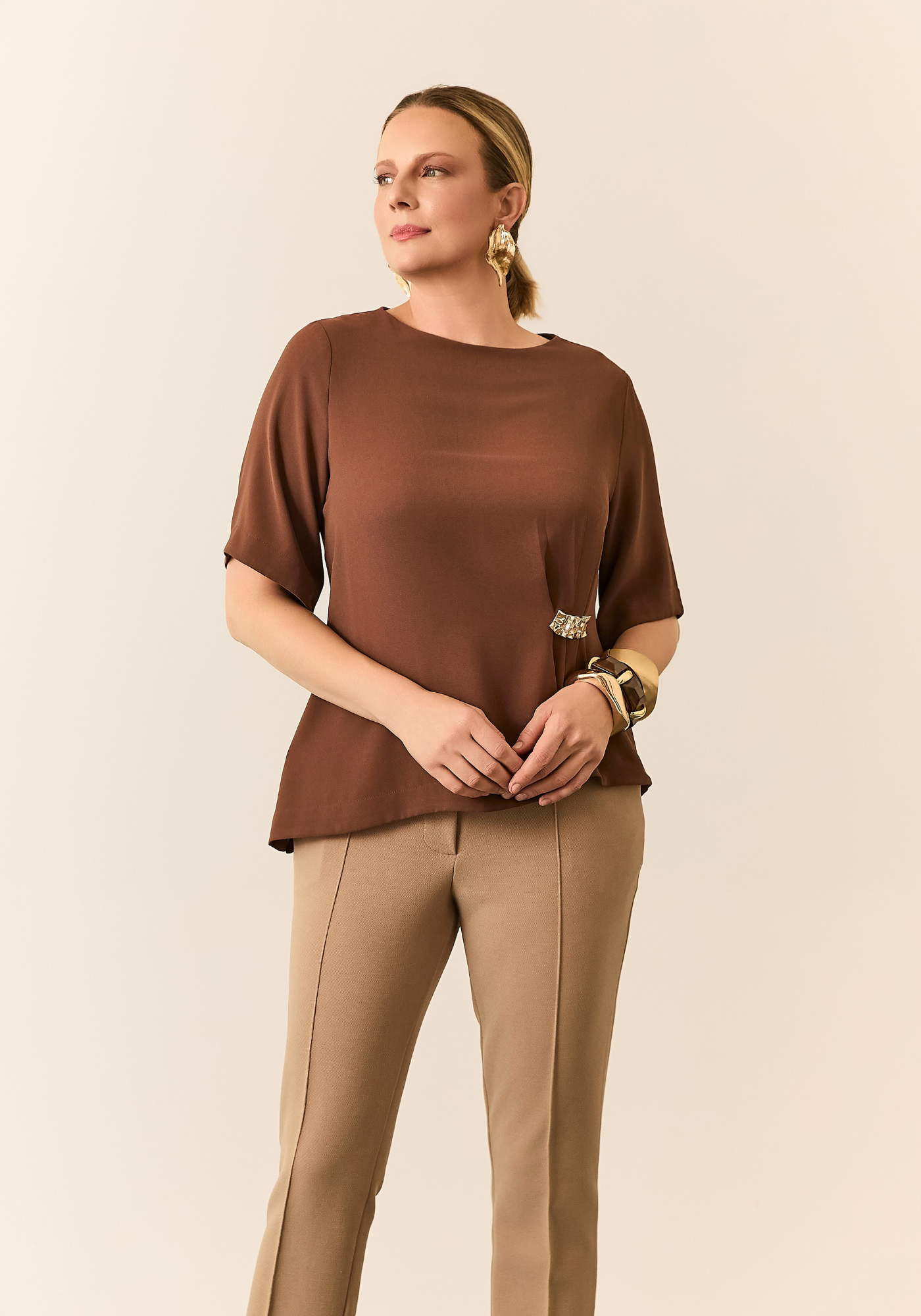 Detalhes- Fivela discreta dourada, trazendo sofisticação a peça