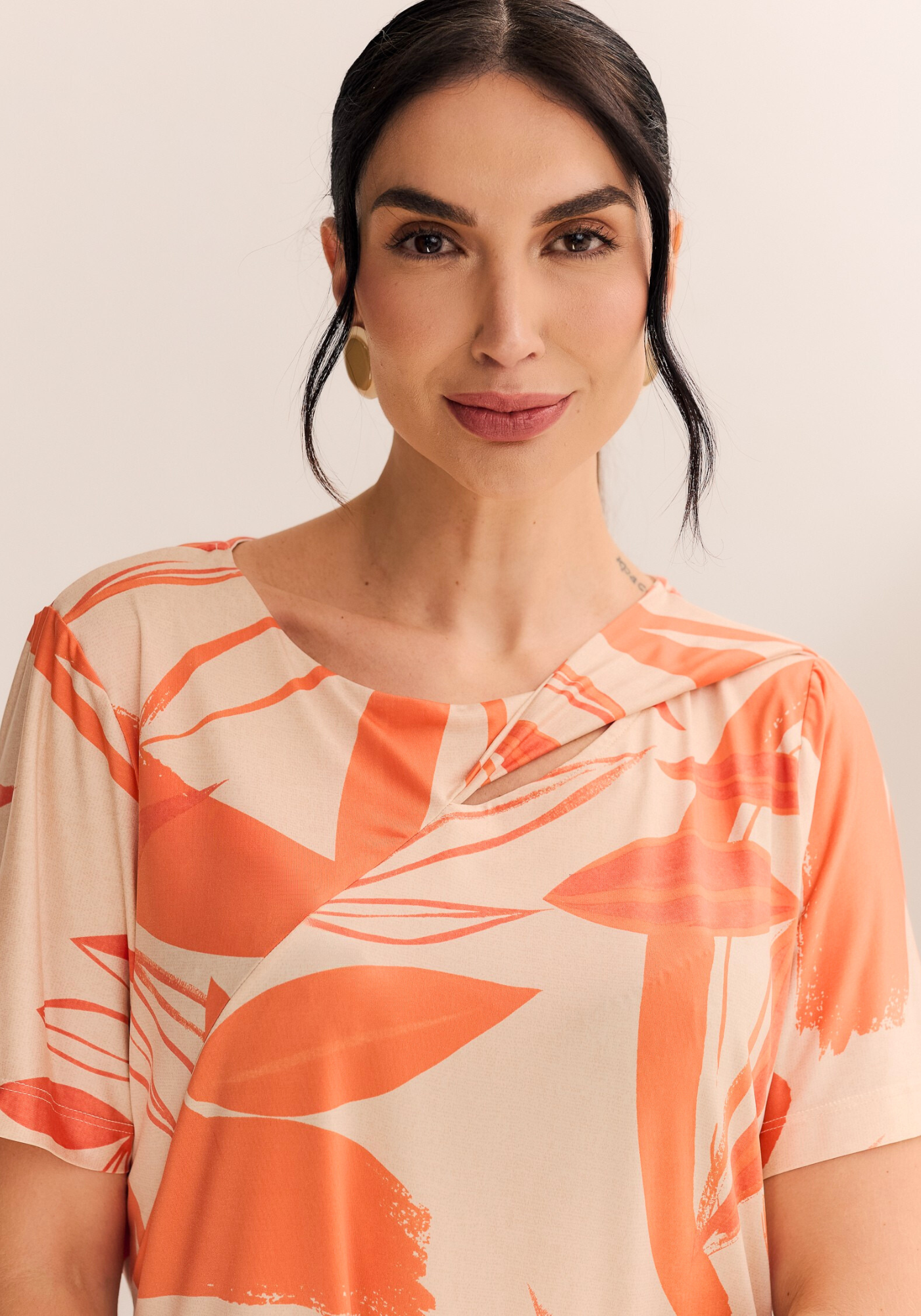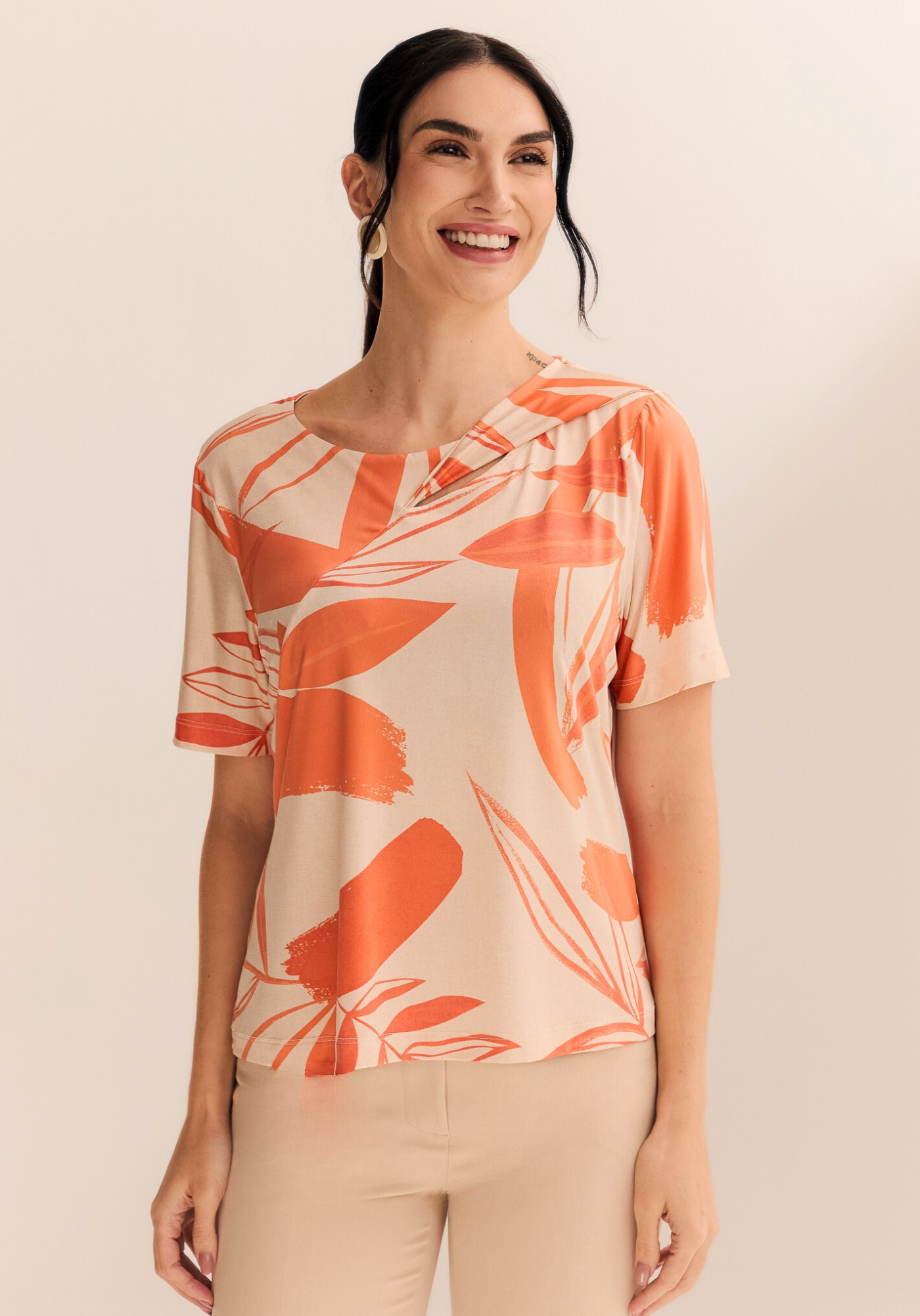 Estampa Exclusiva de Folhagens - Design moderno com motivos de folhas em azul marinho sobre fundo nude, trazendo sofisticação e estilo ao visual