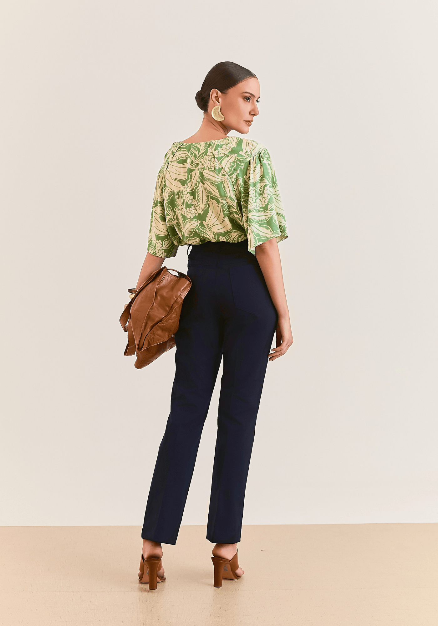 Modelagem Clássica Repaginada: Corte reto e cintura alta, alonga a silhueta e valoriza as curvas sem marcar, garantindo conforto o dia todo.