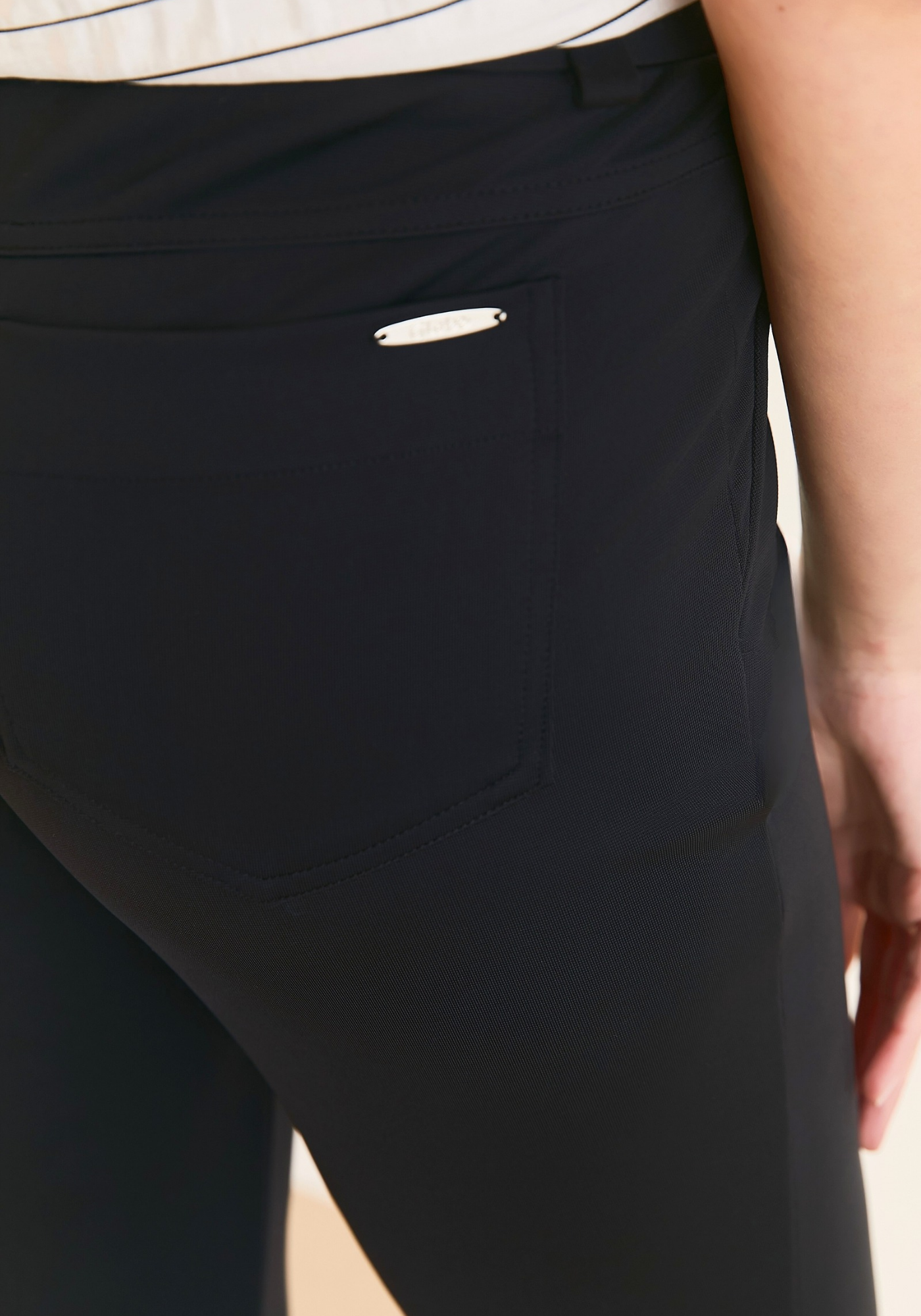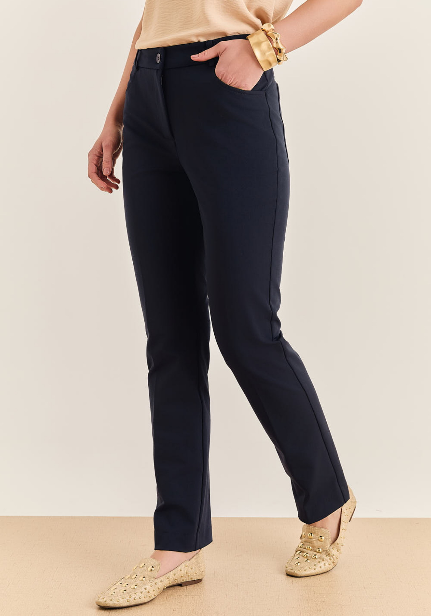 Caimento Impecável: A estrutura da alfaiataria, o visual do jeans. Tecido técnico com compressão e elegância para o dia a dia. Versátil, confortável e refinada.