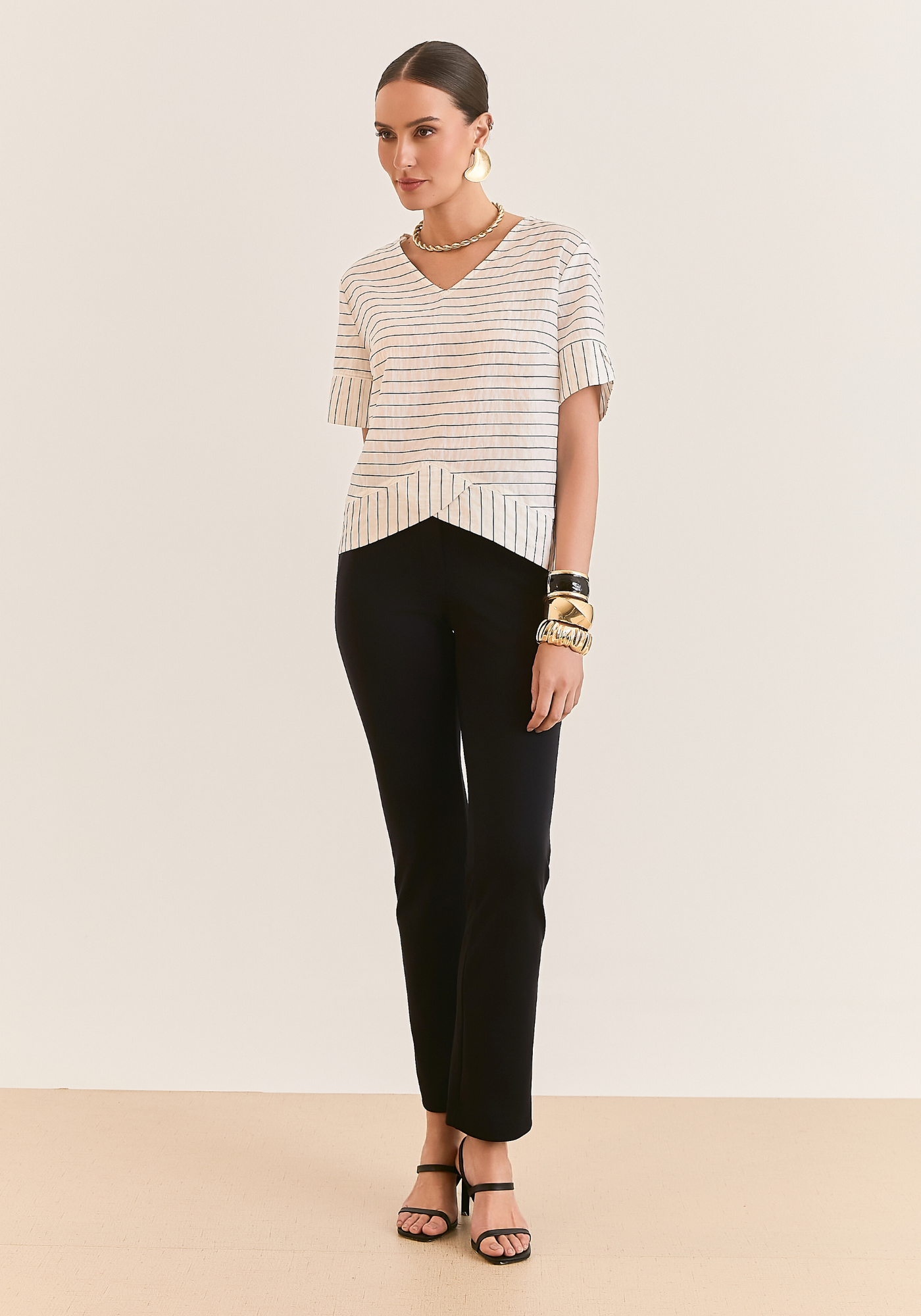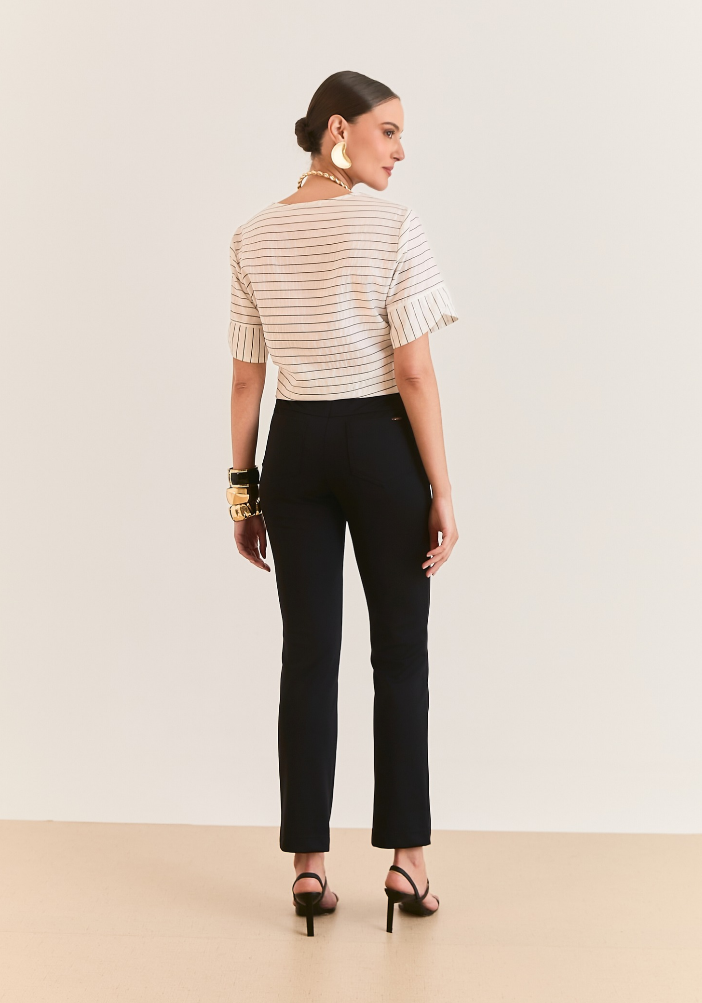 Modelagem Clássica Repaginada: Corte reto e cintura alta, alonga a silhueta e valoriza as curvas sem marcar, garantindo conforto o dia todo.