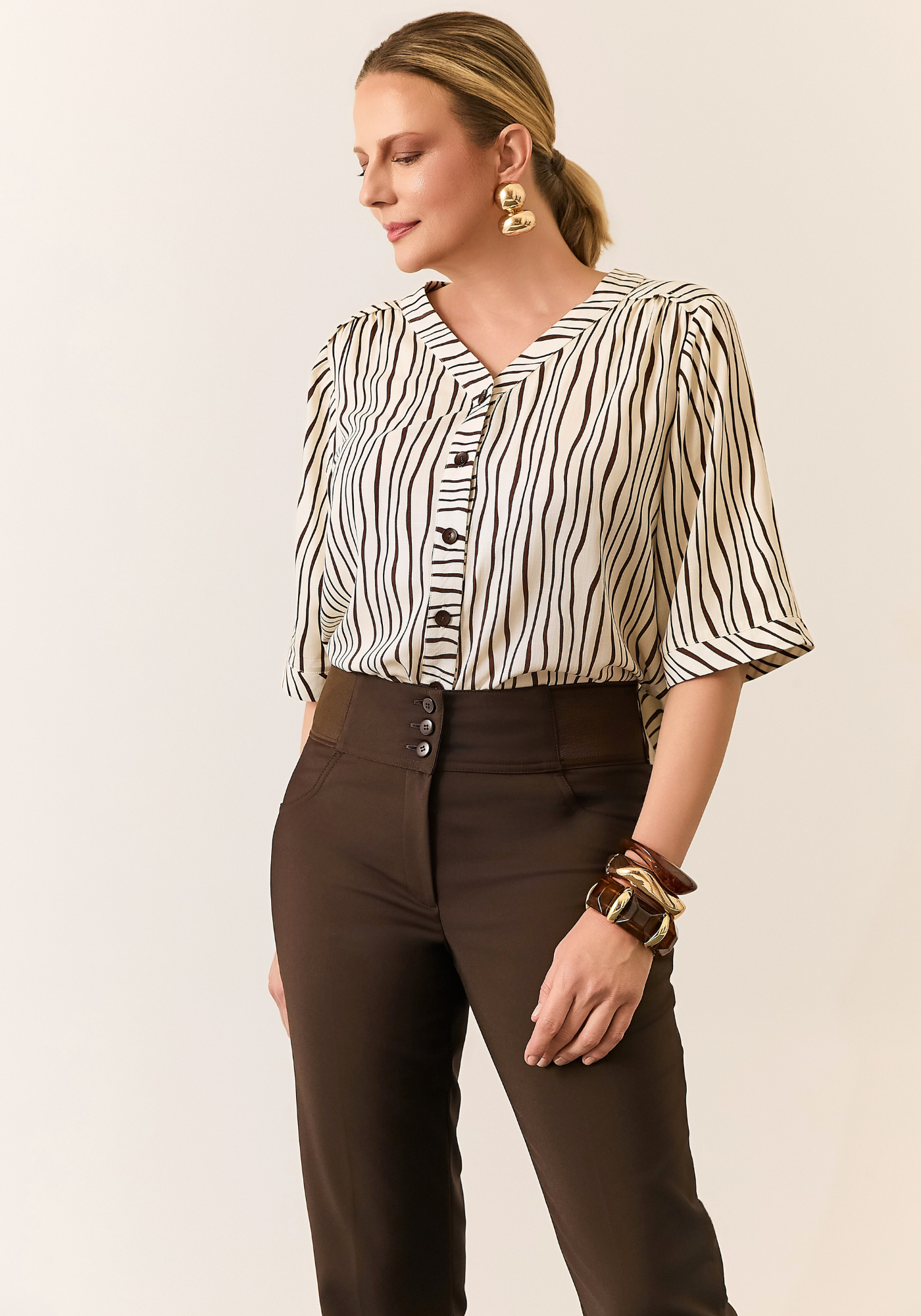Detalhes Refinados: Fechamento frontal com três botões e zíper, para um toque extra de sofisticação.