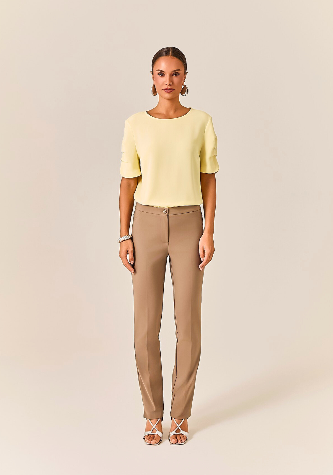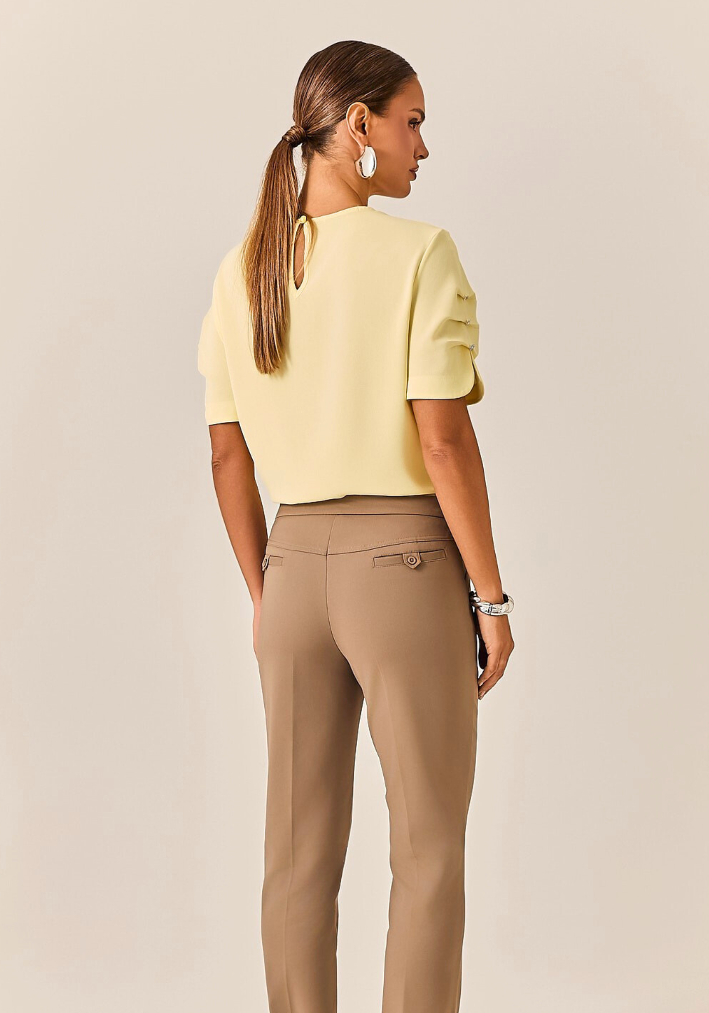 Detalhes Sofisticados: Vinco frontal, fechamento com zíper e botão, bolsos laterais e traseiros embutidos.