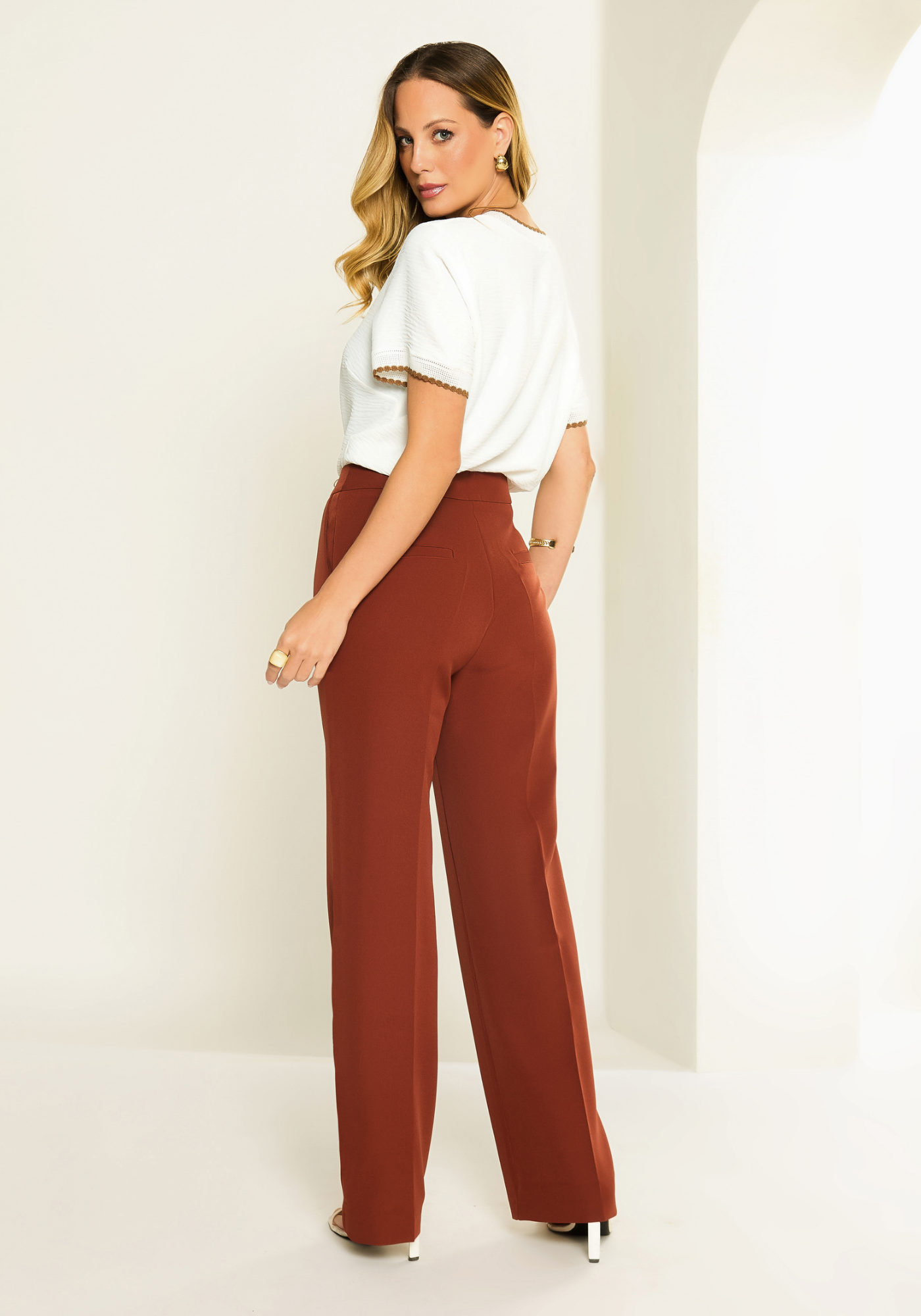 Porque a Calça Toledo foi criada para mulheres que valorizam alfaiataria de verdade — aquela que estrutura o corpo, acompanha o movimento e se mantém impecável ao longo do dia.
