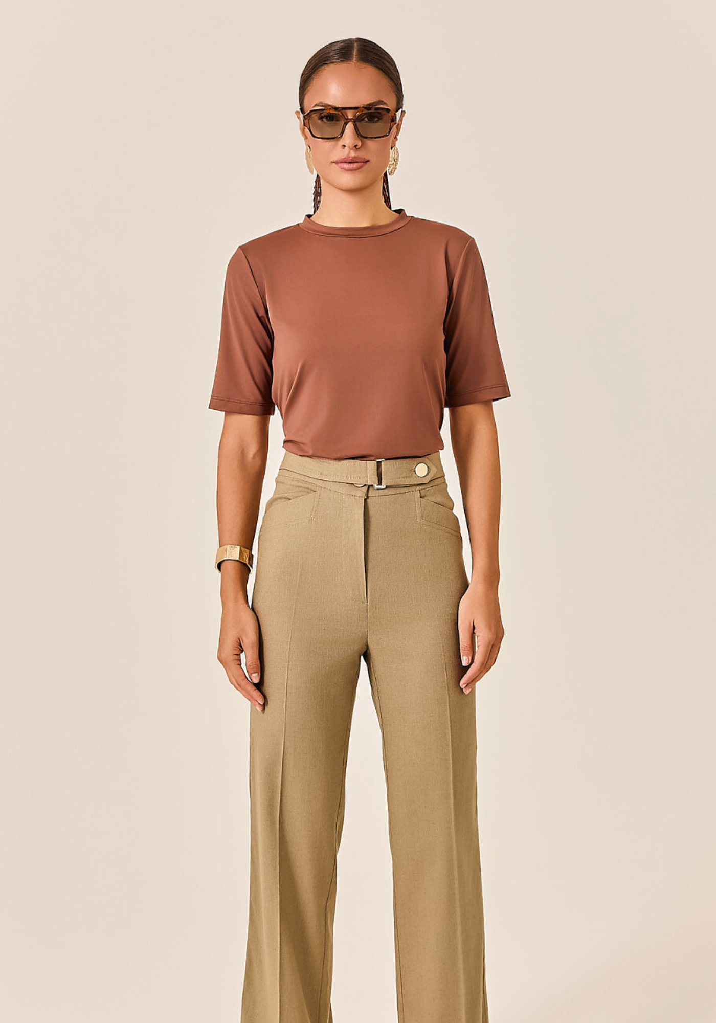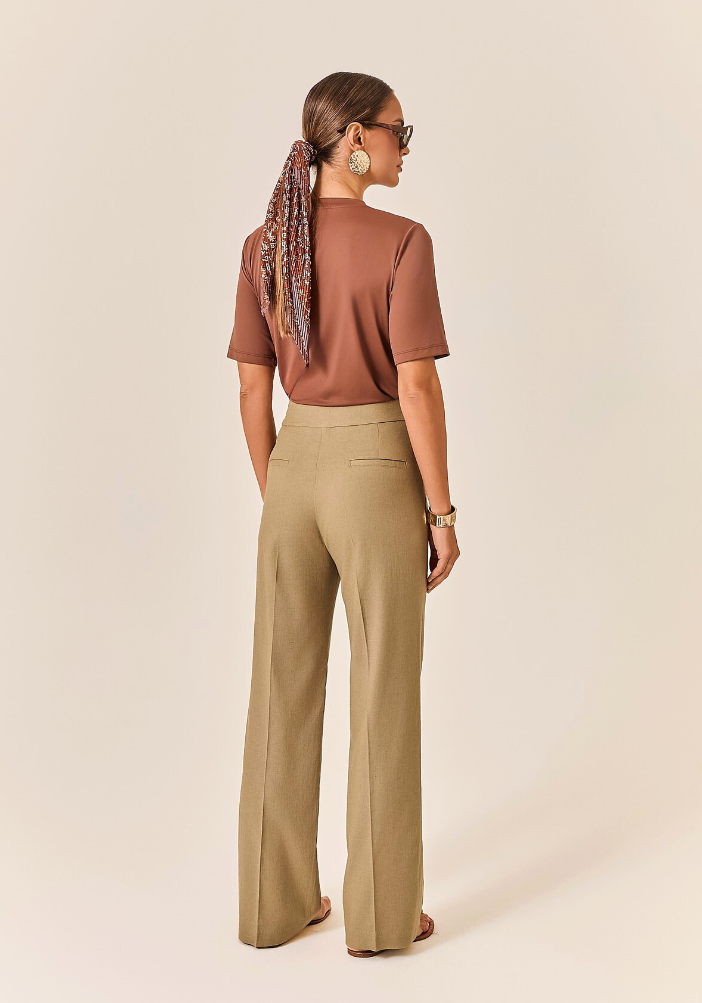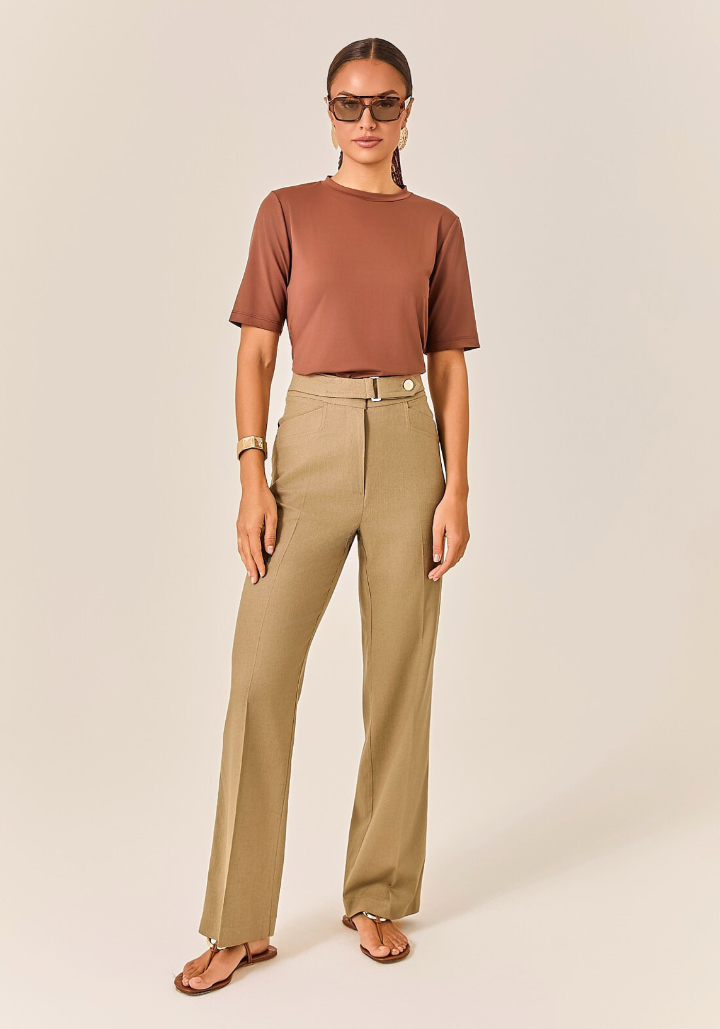 Os bolsos faca laterais são funcionais e discretos, enquanto o bolso falso nas costas mantém o visual clean e moderno. O vinco de passadoria frontal garante um caimento sempre alinhado, valorizando a silhueta com um toque de alfaiataria clássica.