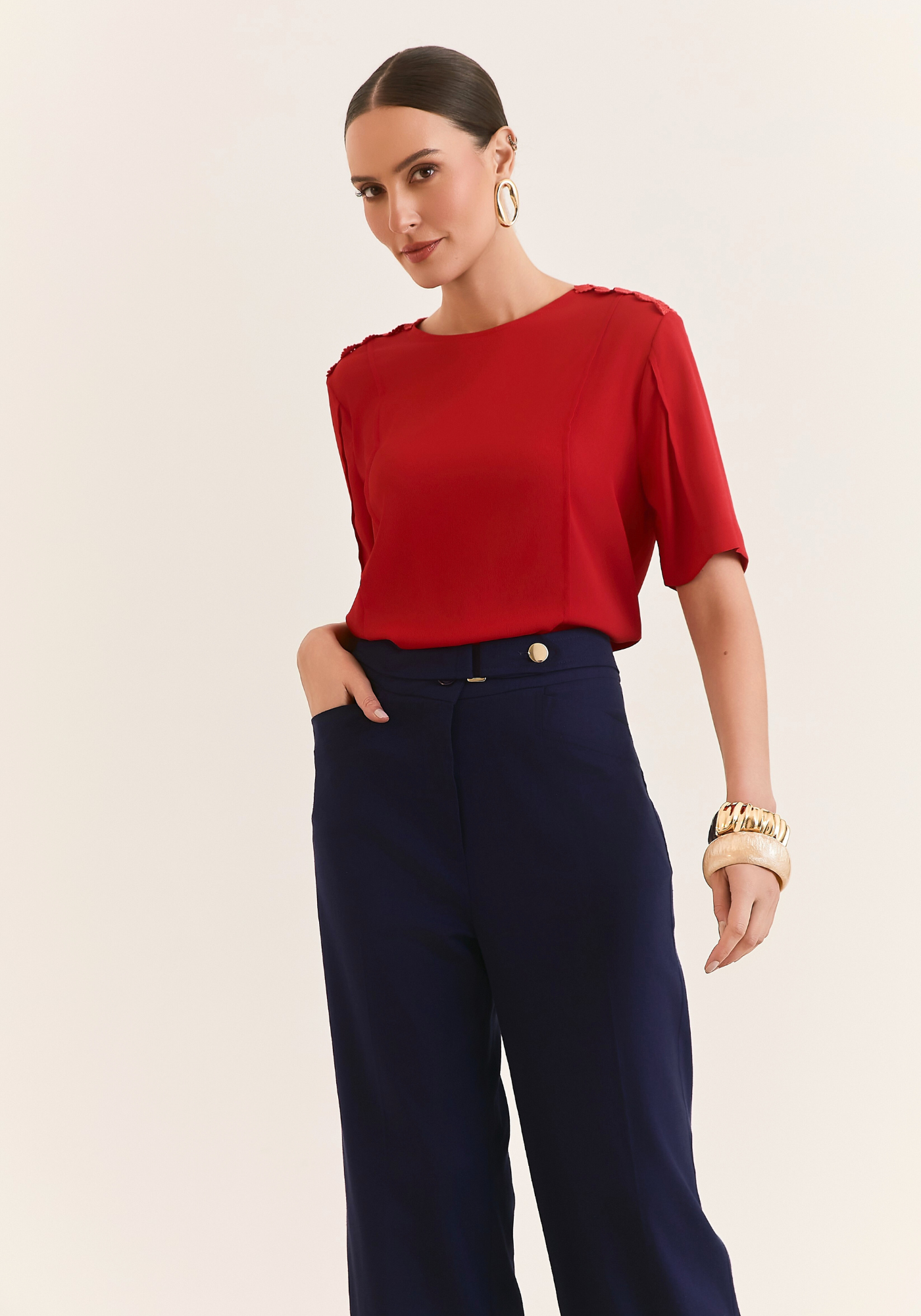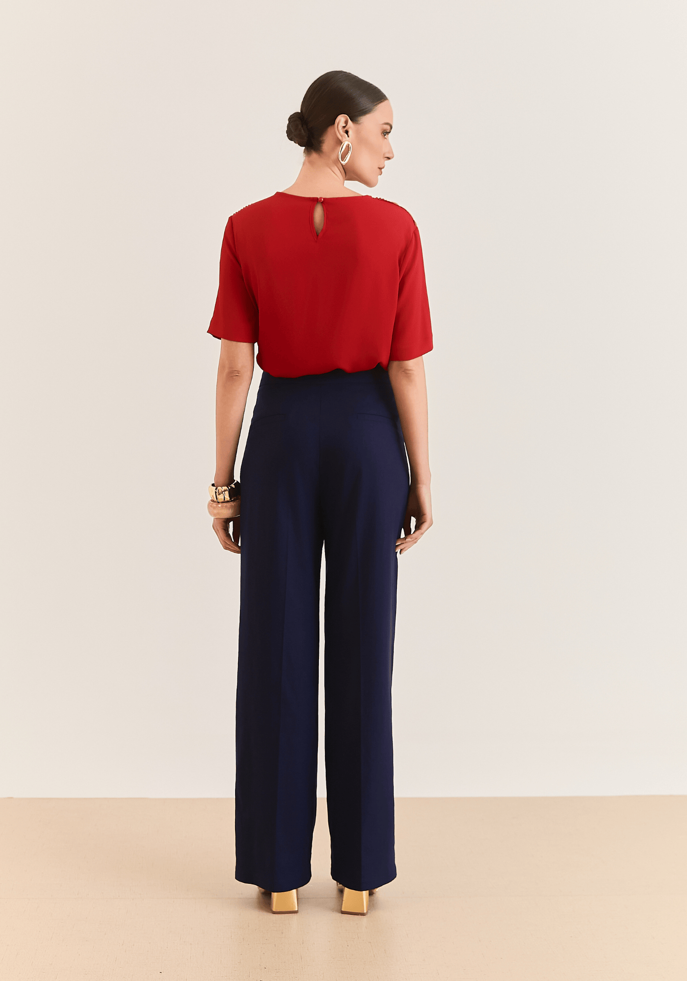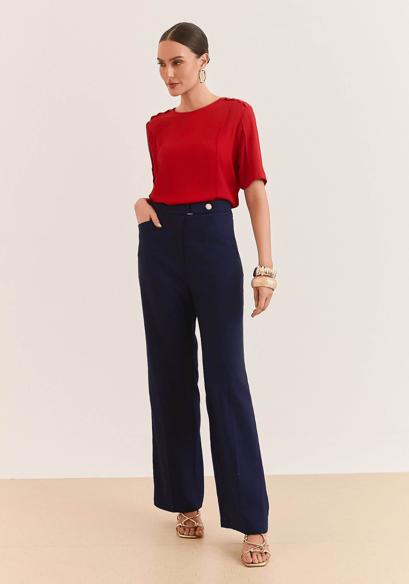 Os bolsos faca laterais são funcionais e discretos, enquanto o bolso falso nas costas mantém o visual clean e moderno. O vinco de passadoria frontal garante um caimento sempre alinhado, valorizando a silhueta com um toque de alfaiataria clássica.