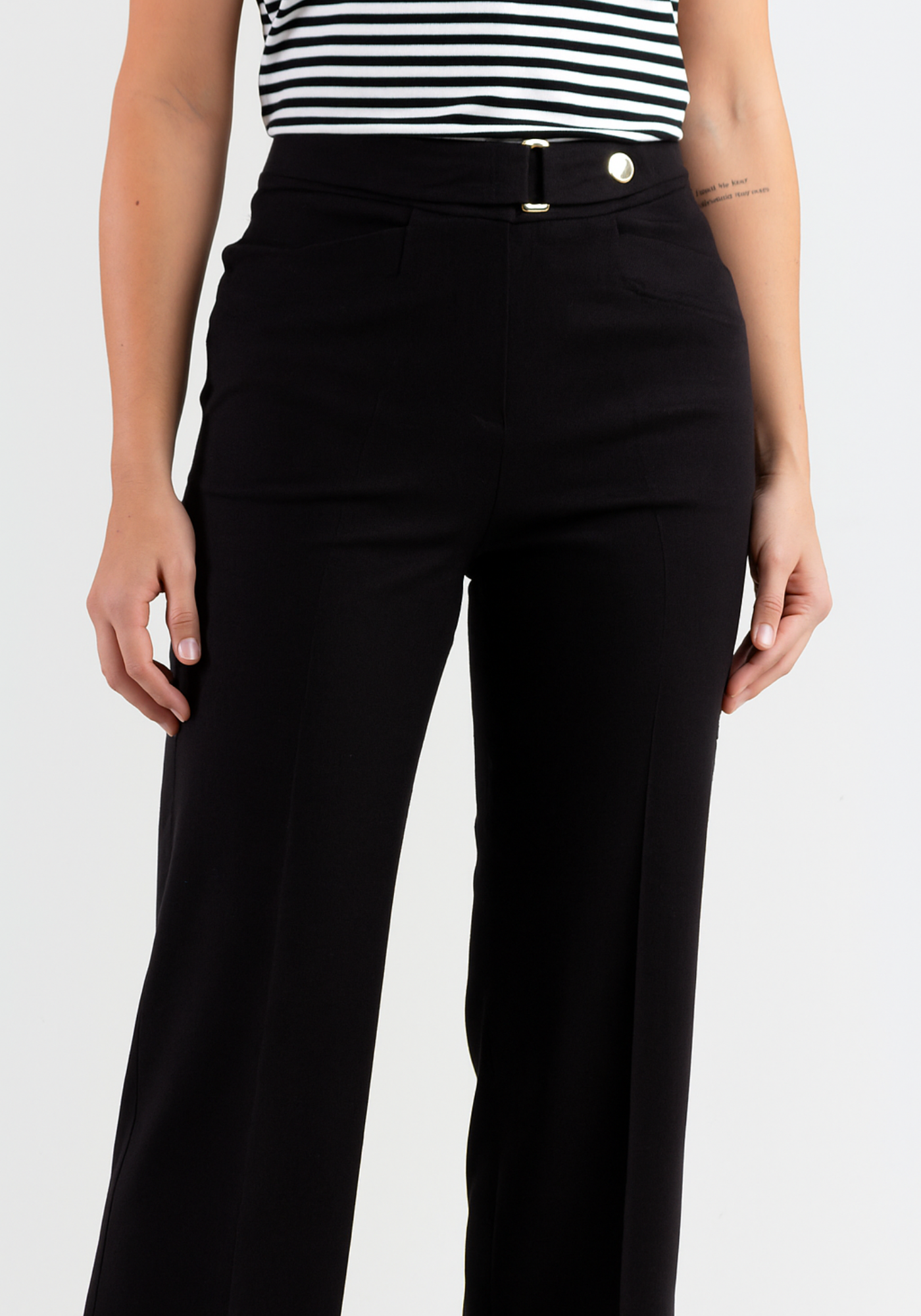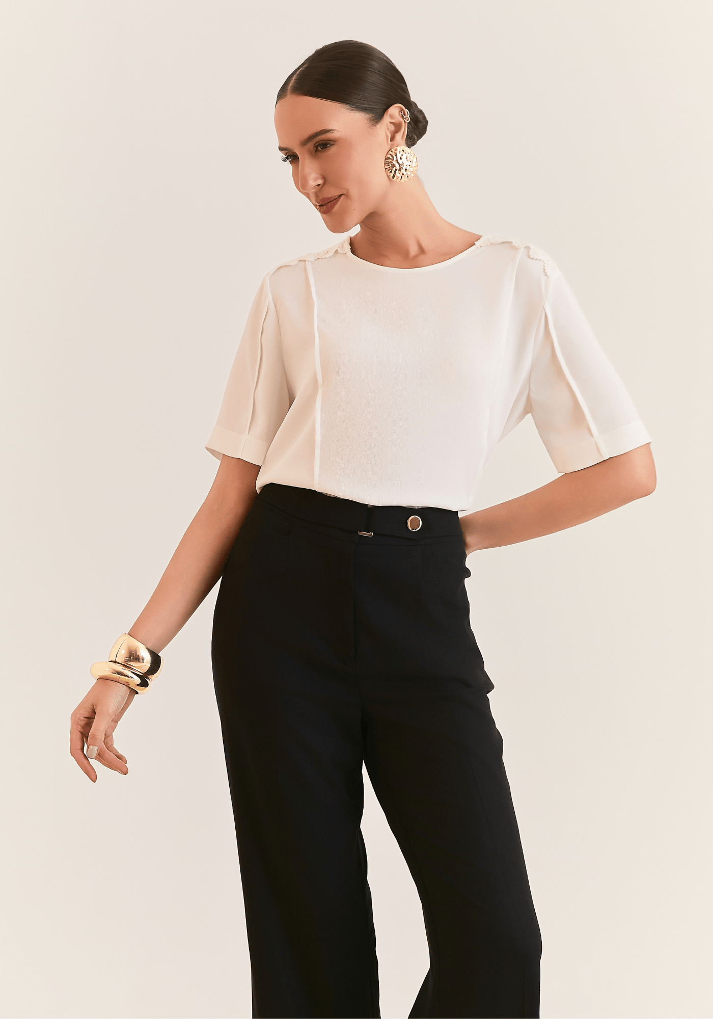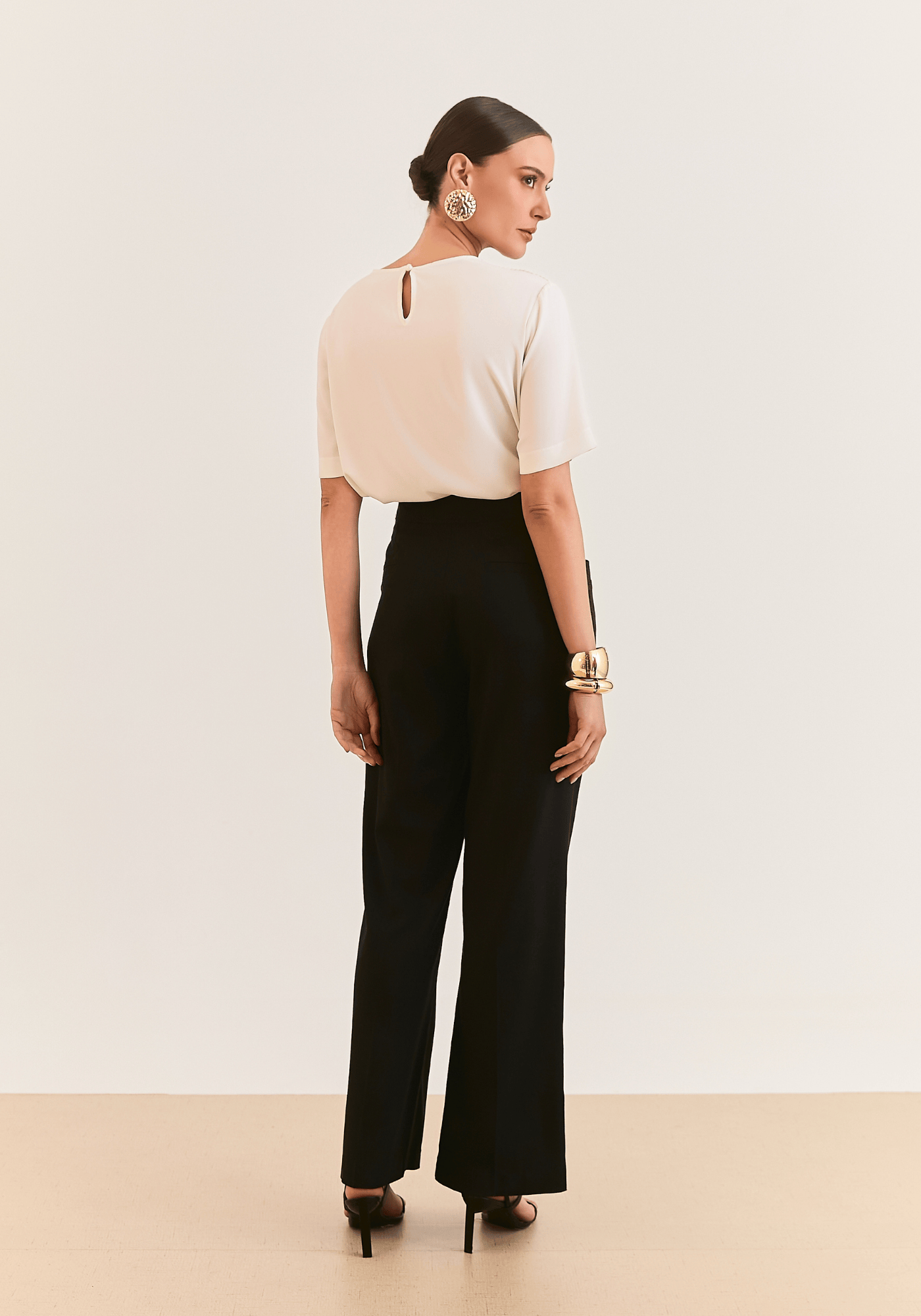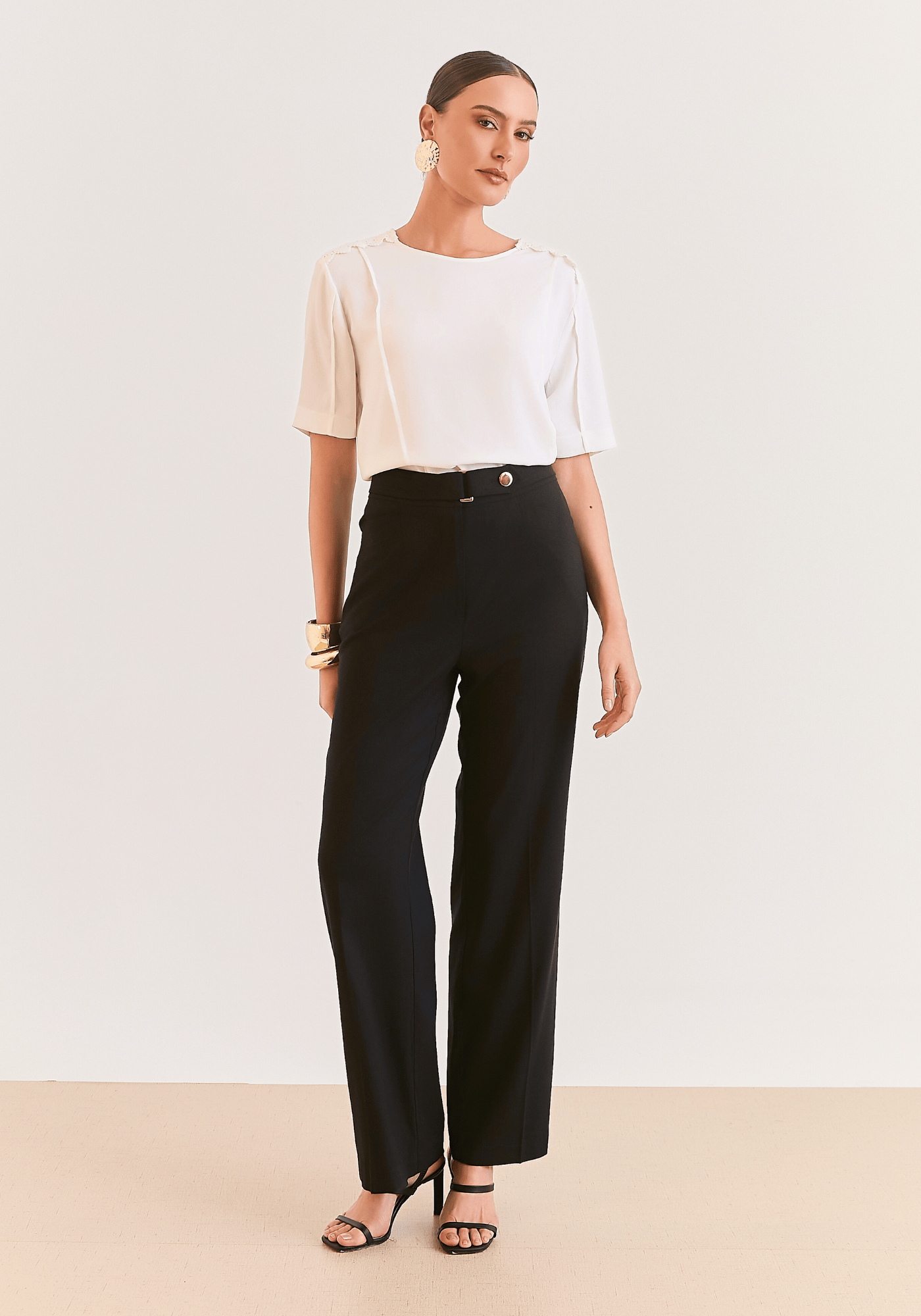 Os bolsos faca laterais são funcionais e discretos, enquanto o bolso falso nas costas mantém o visual clean e moderno. O vinco de passadoria frontal garante um caimento sempre alinhado, valorizando a silhueta com um toque de alfaiataria clássica.