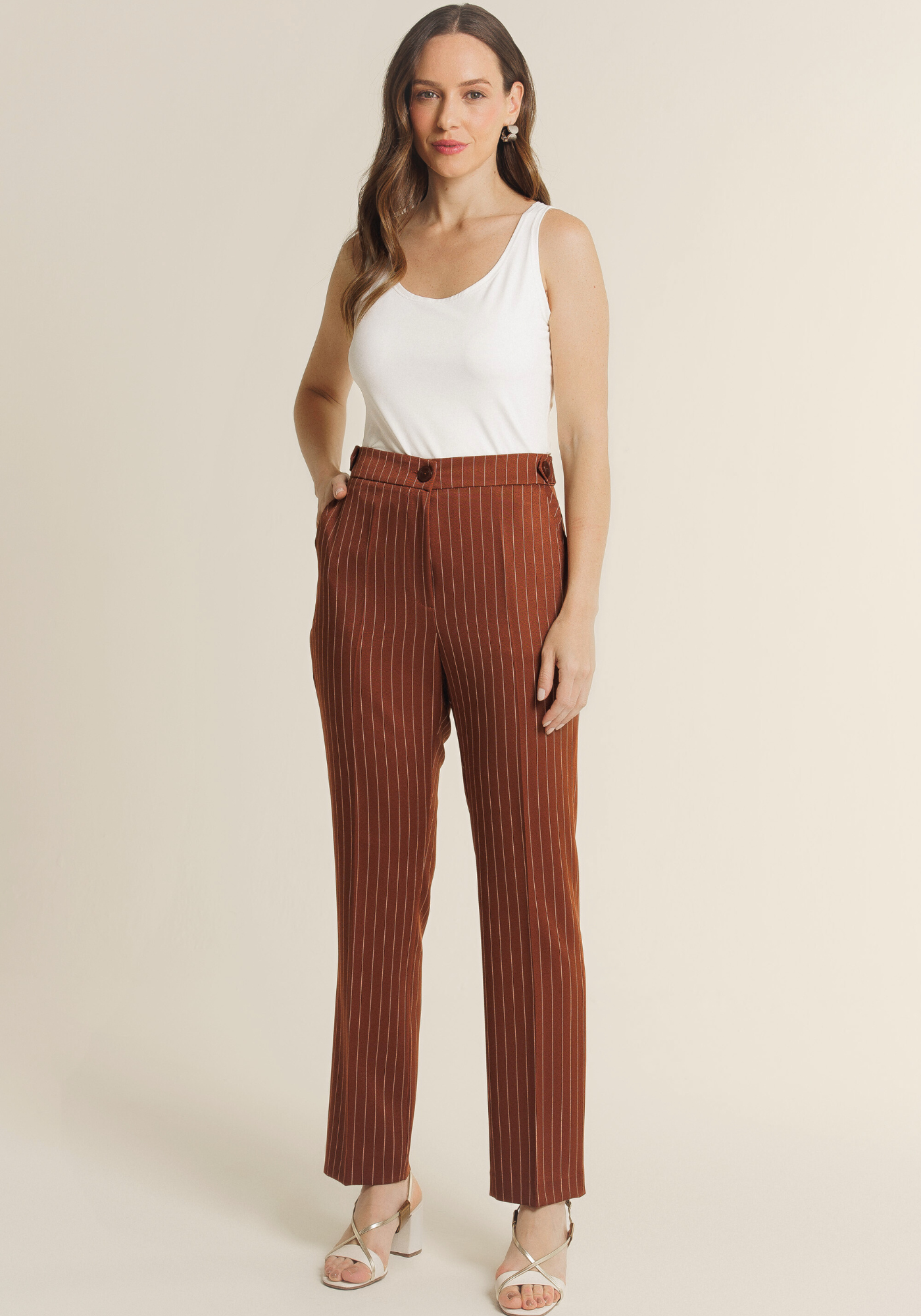 Ao escolher esta calça, você investe em um produto que alia o padrão atemporal risca de giz, o acabamento impecável da alfaiataria e o detalhe sofisticado da martingale. com foco no bem-estar da mulher moderna, proporcionando ajuste perfeito sem comprometer o estilo. A qualidade do tecido e os detalhes refinados fazem dela uma peça essencial para quem busca versatilidade, elegância e conforto.