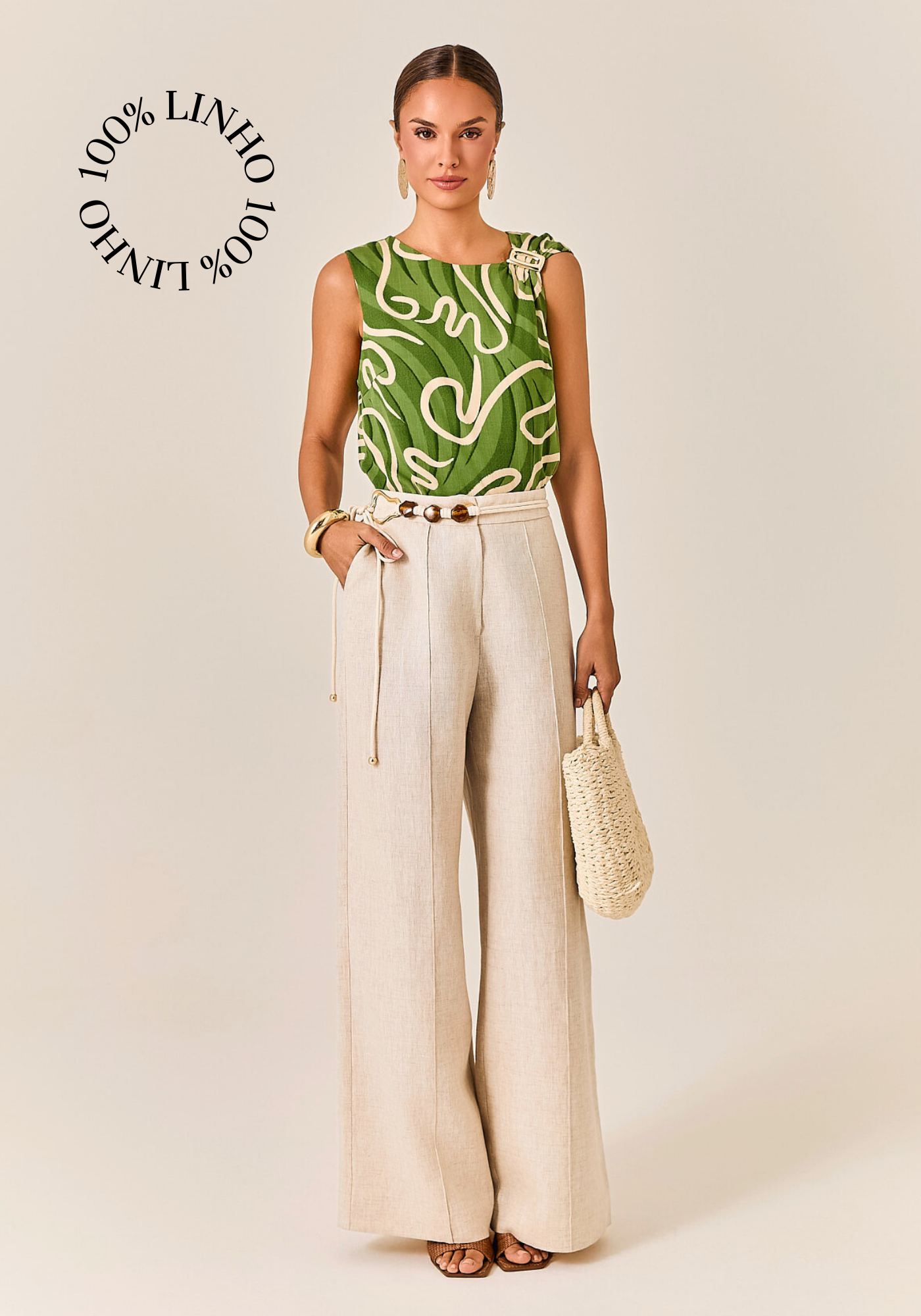 Calça Wide Leg confeccionada em linho puro 100%
