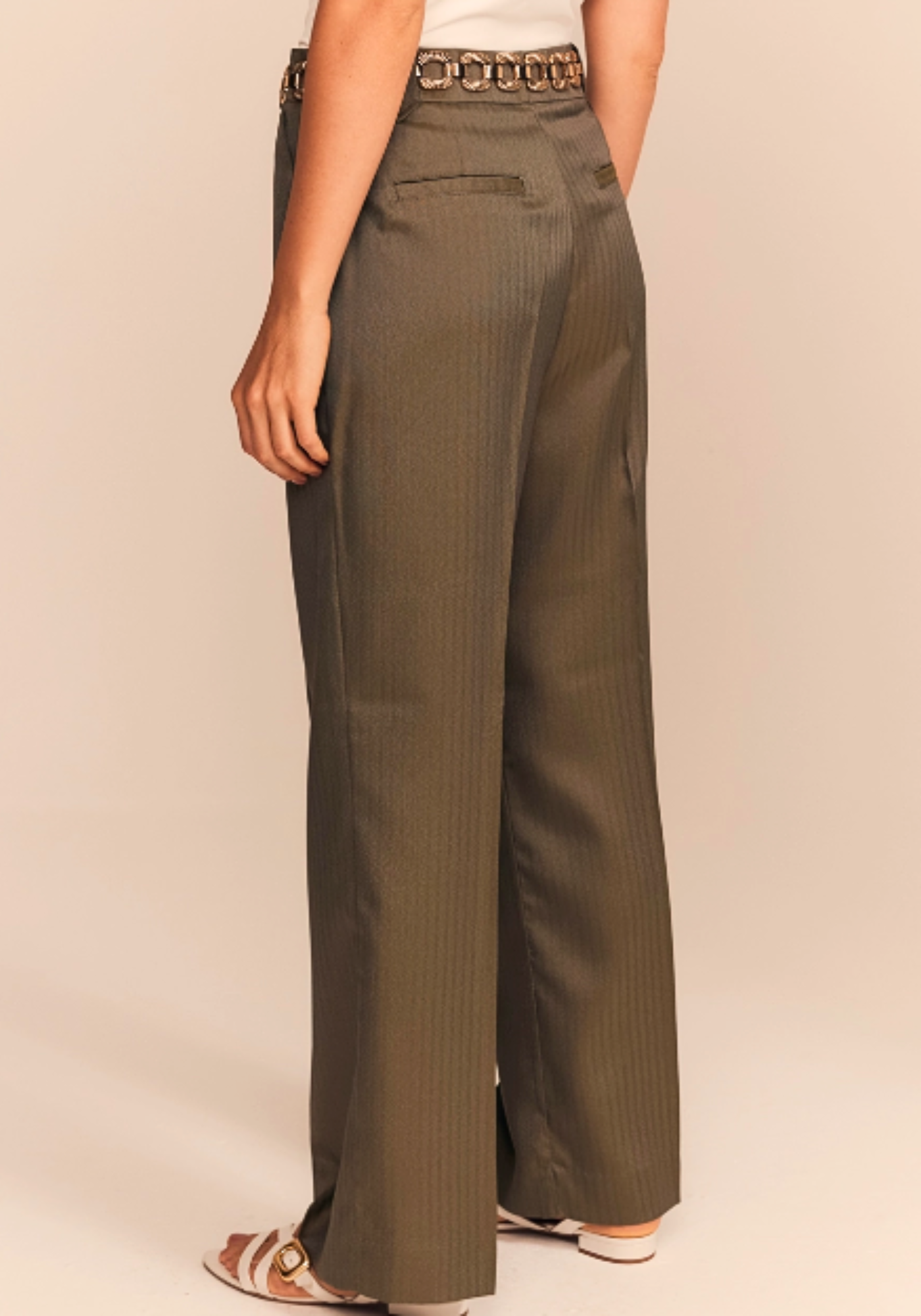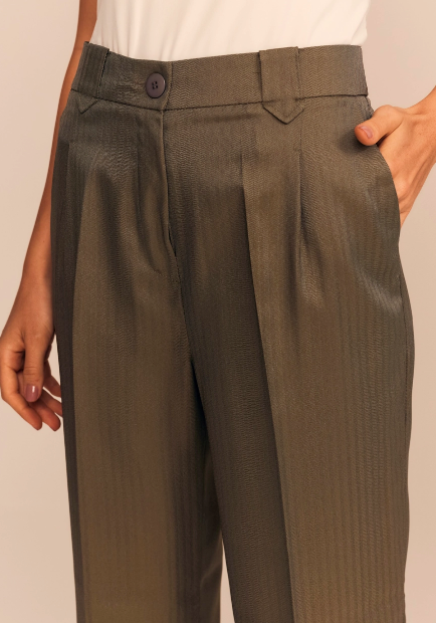 Detalhes Sofisticados: Vinco frontal, fechamento com zíper e botão, bolsos laterais e bolsos de alfaiataria frontais.