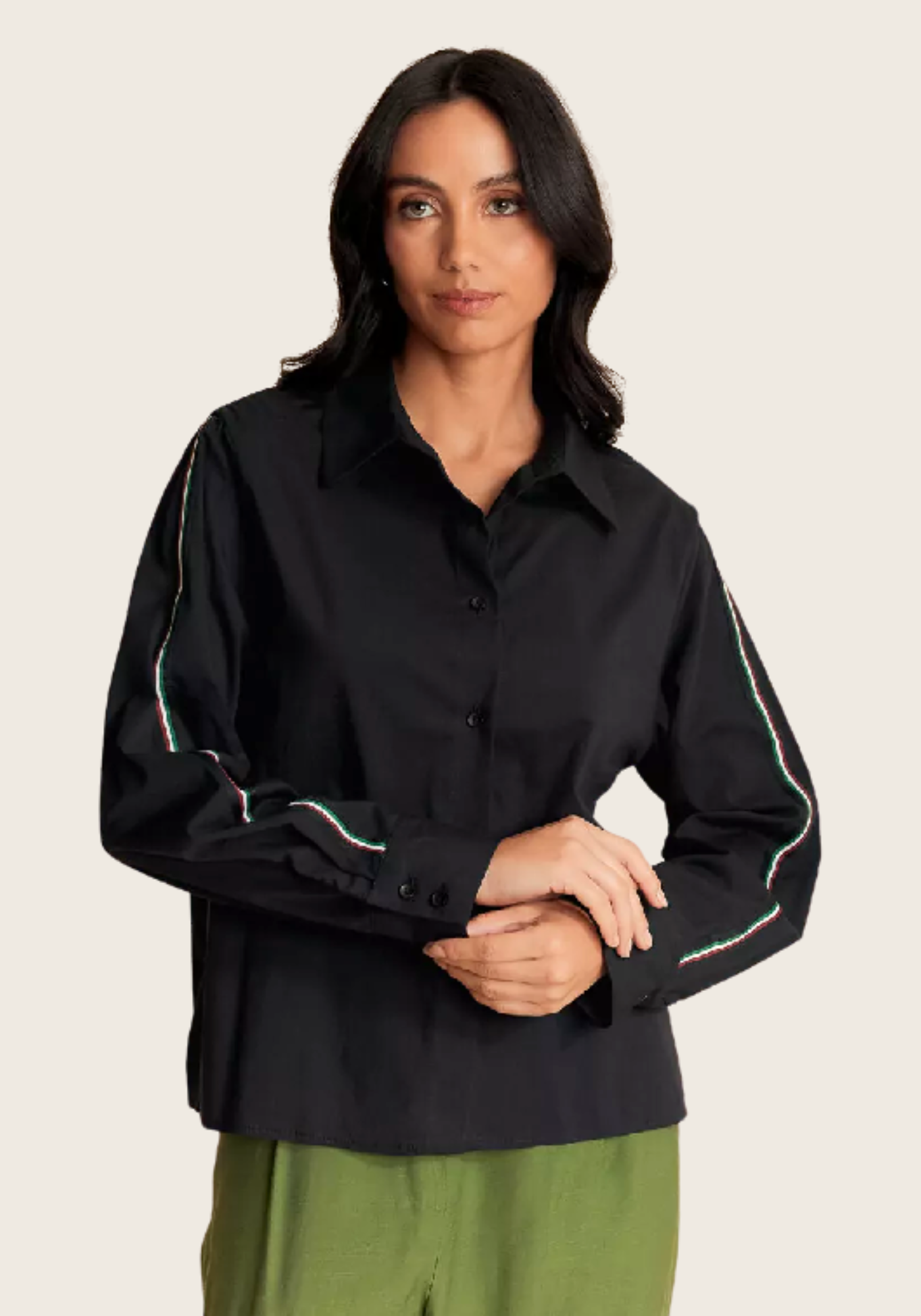 Possui caimento reto, gola com colarinho, fechamento frontal por botões, mangas longas, barra arredondada e acabamento pespontado