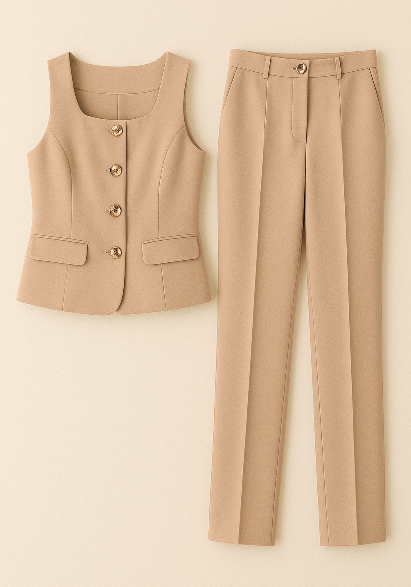 O colete possui fechamento frontal por botões e sem mangas, ideal para sobreposição.