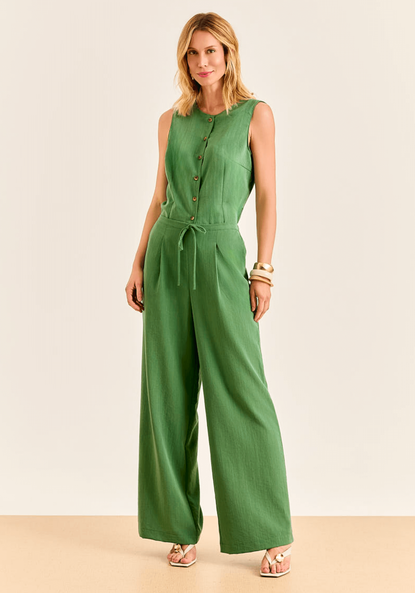 O colete possui fechamento frontal por botões e sem mangas, ideal para sobreposição.