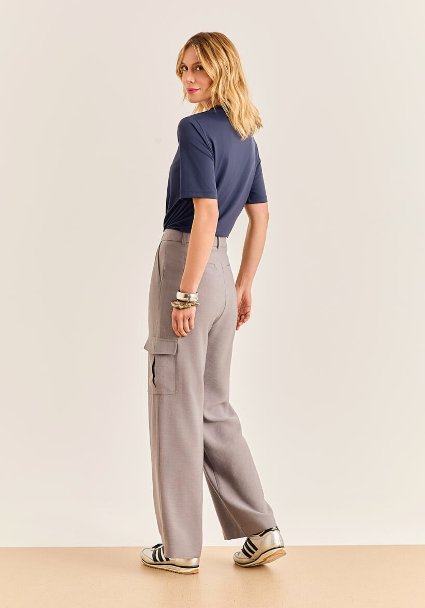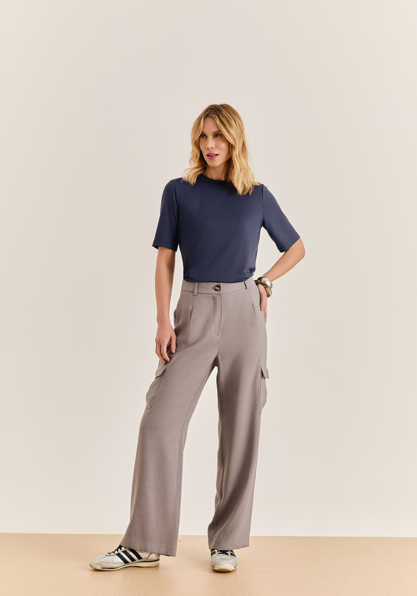 Possui gola redonda, mangas curtas e acabamento pespontado