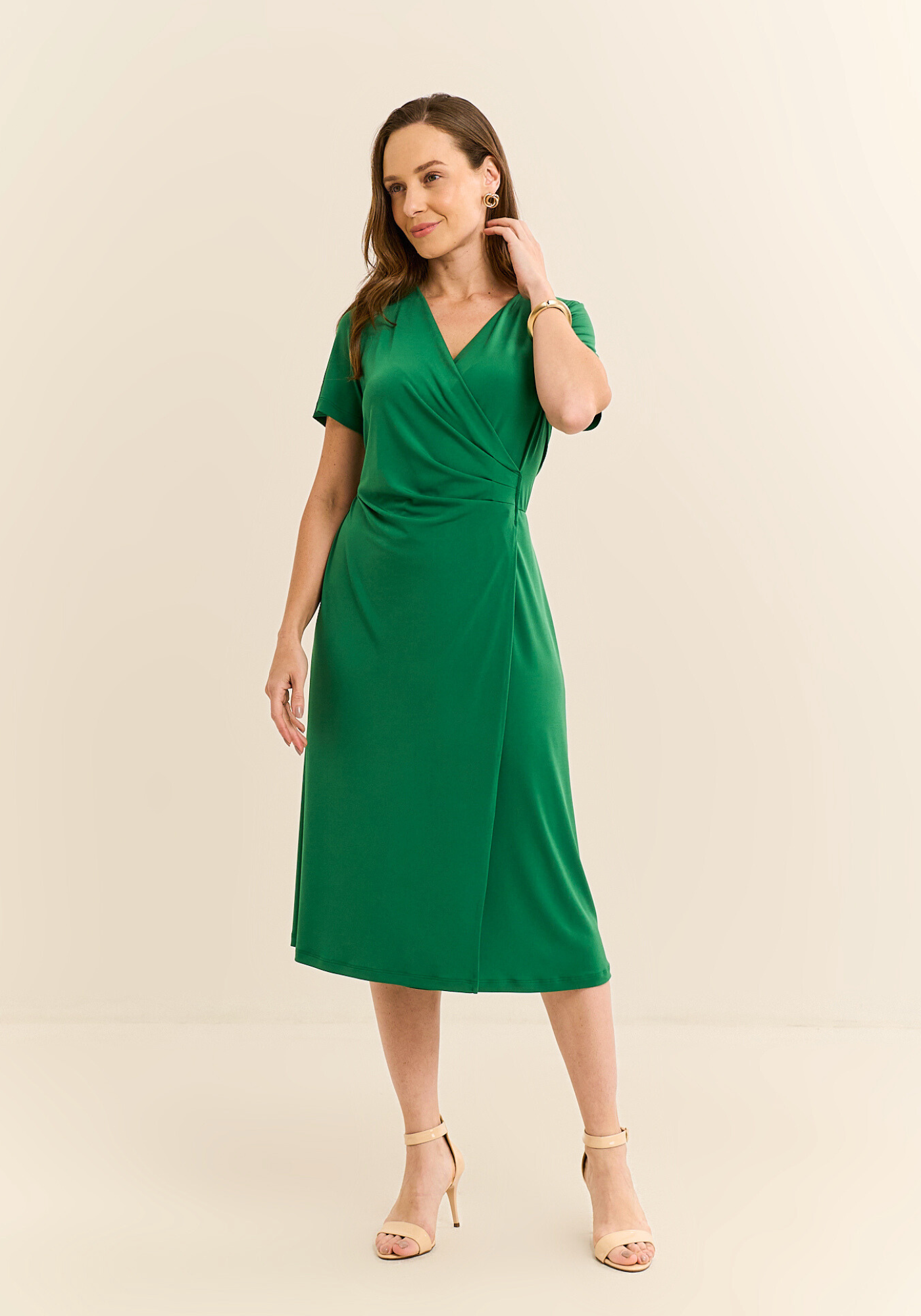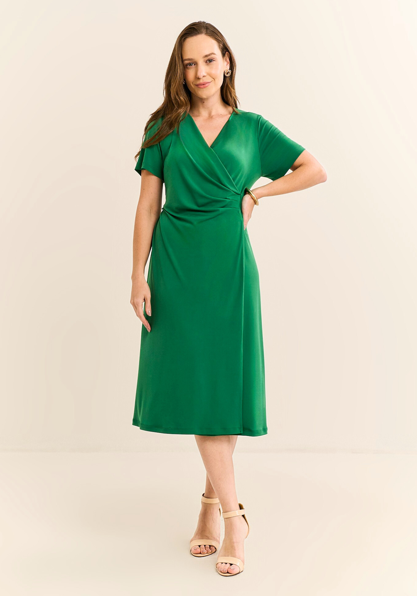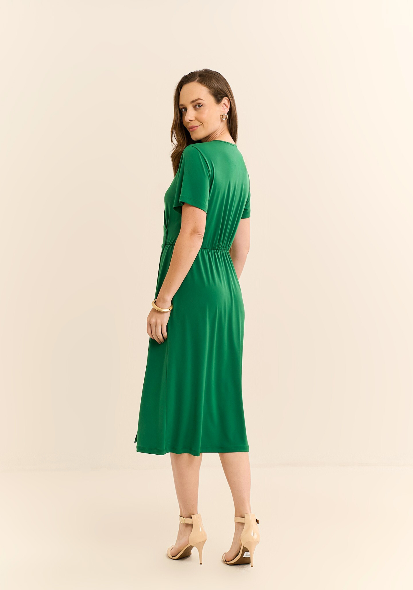 O vestido midi possui manga curta, facilitando o movimento