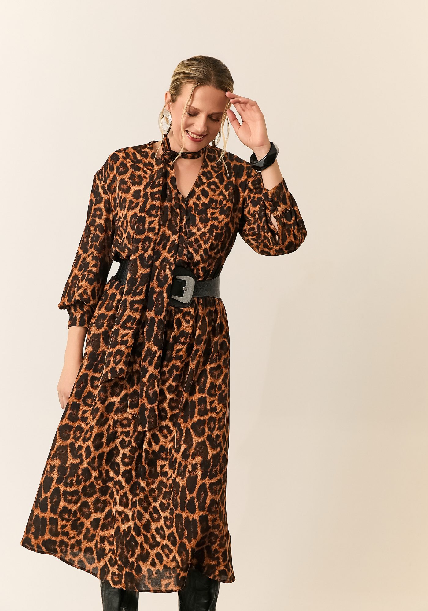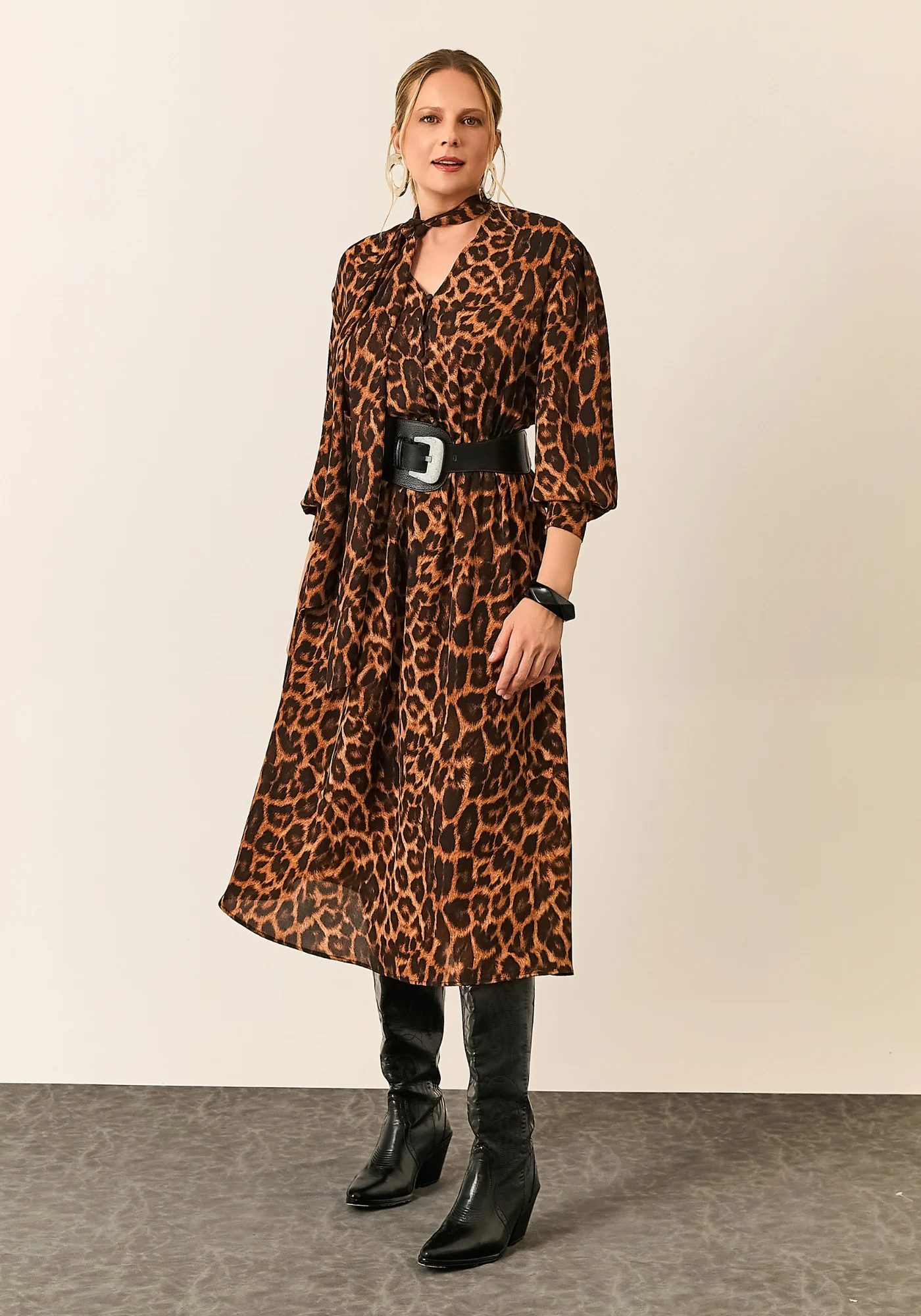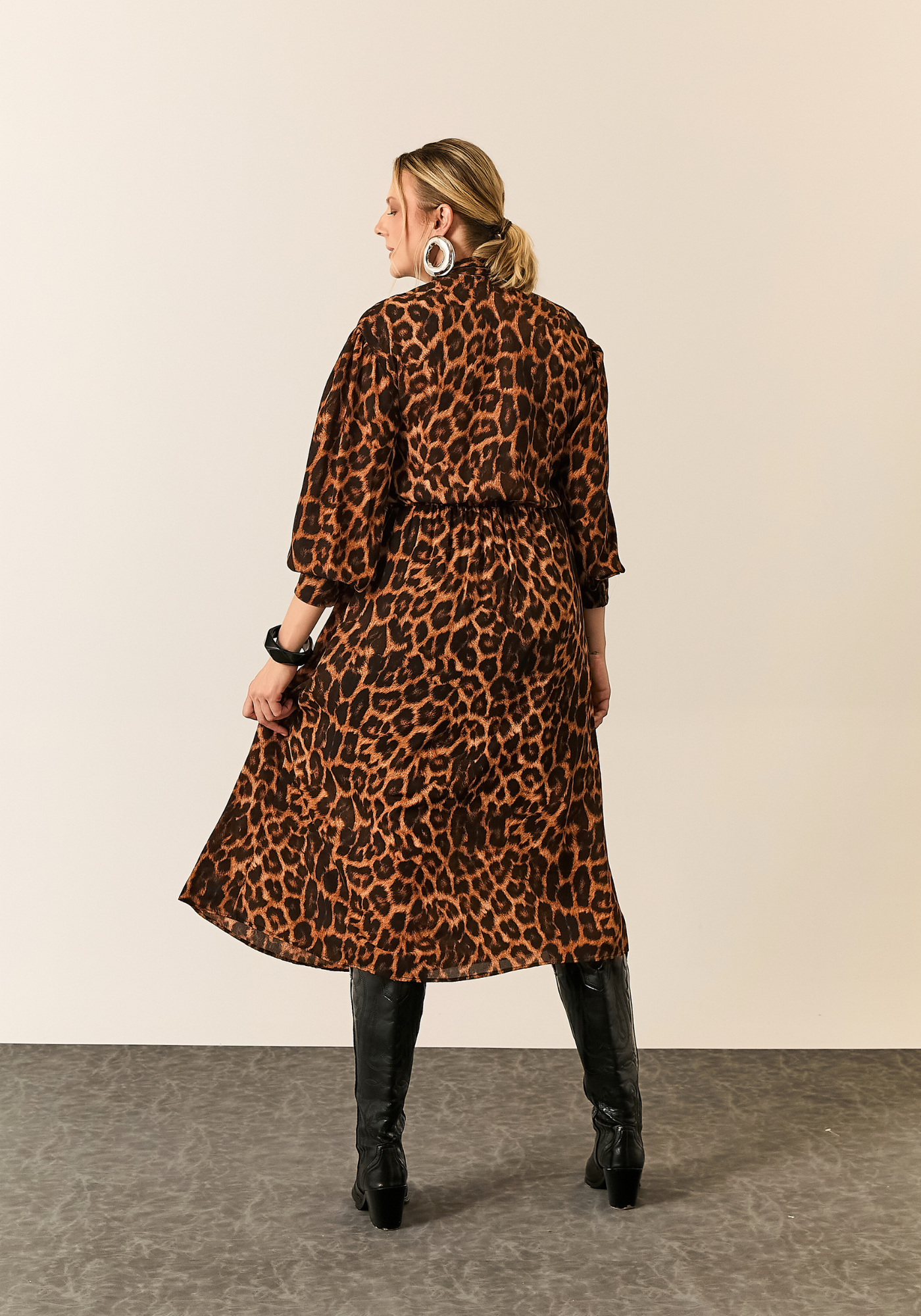 A peça conta com mangas longas e gola com amarração no pescoço