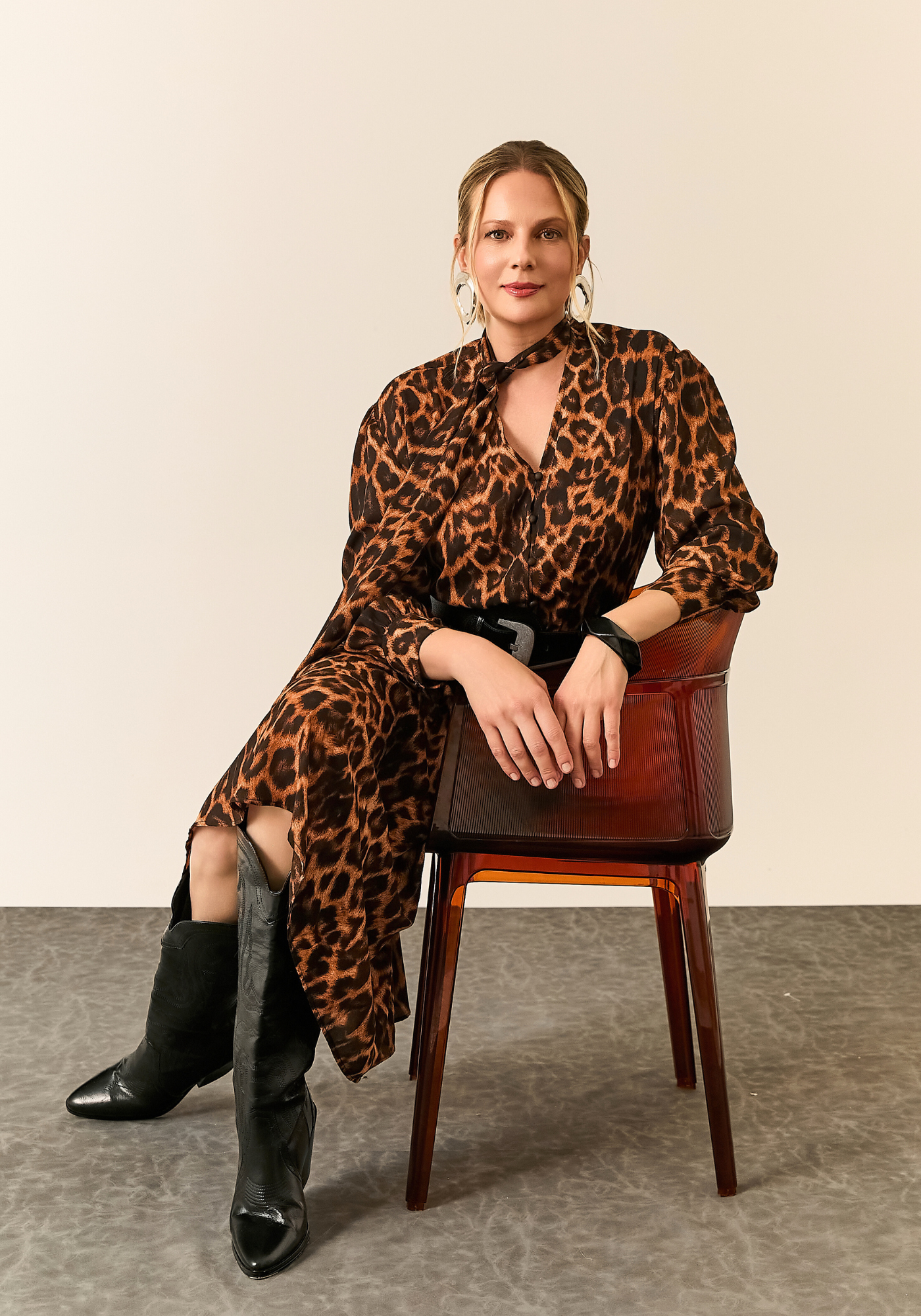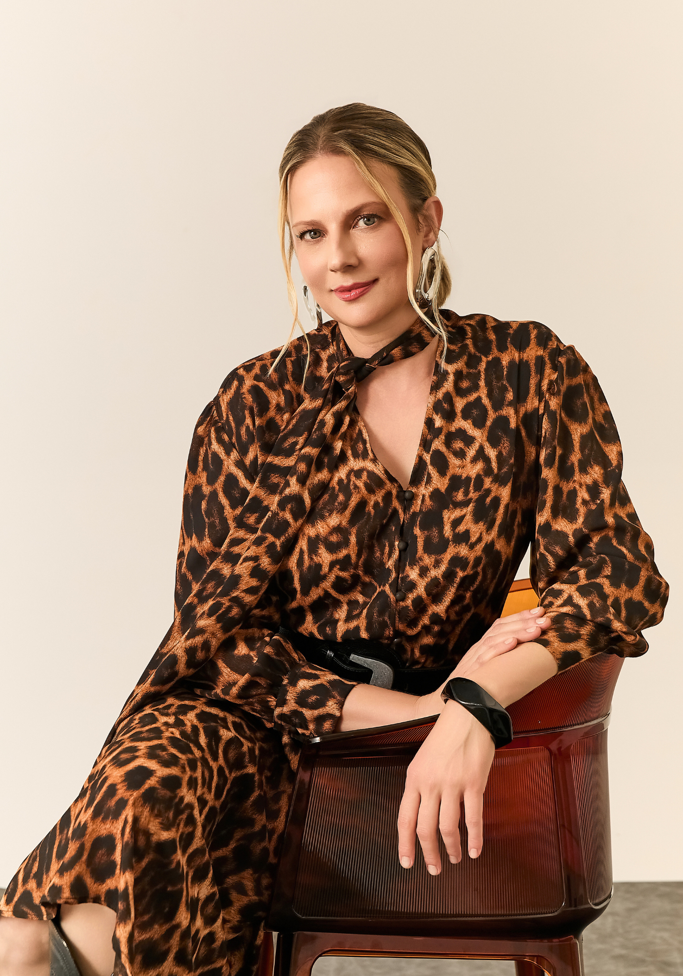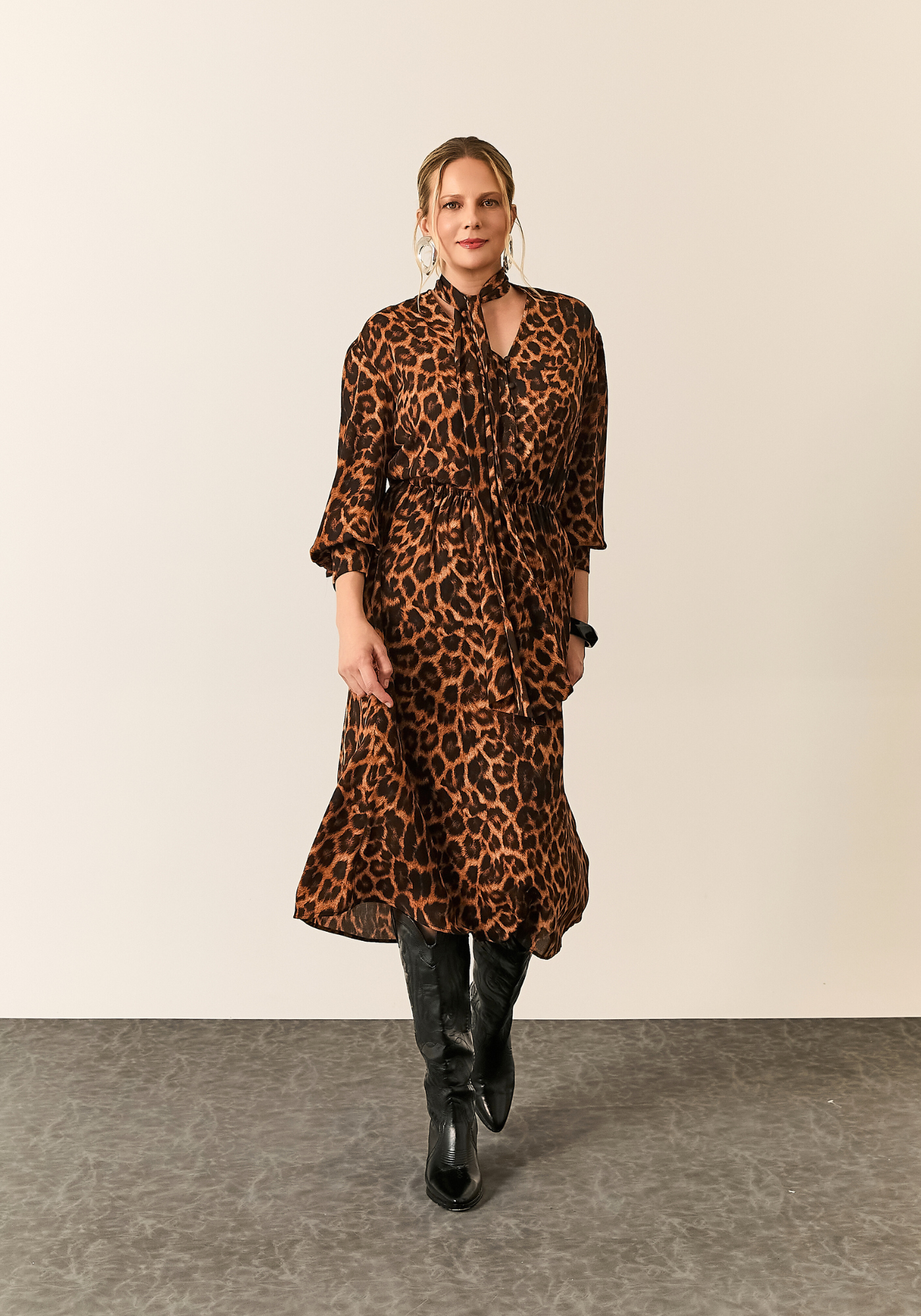 A peça conta com mangas longas e gola com amarração no pescoço